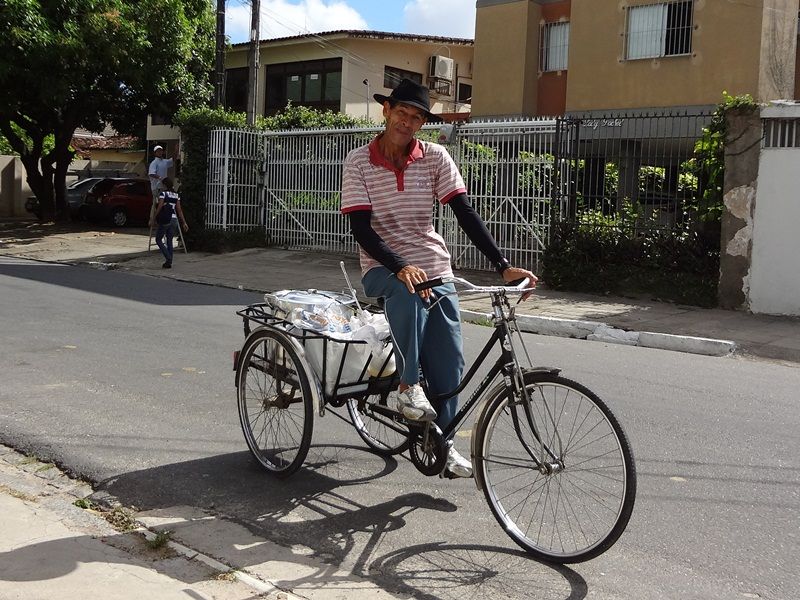 O problema com esperar para publicar no jornal é que às vezes não consigo encaixar o registro em algum texto que esteja escrevendo, ou então demora tanto que até perde a graça, ou ainda a imagem é publicada fora do seu contexto original, abafando assim boa parte do seu frescor. Como exemplo – mais um -, tirei a foto abaixo no dia em que fazia o levantamento das lanças empaladoras, mas pensando em um futuro texto sobre os vários tipos de bicicleta que rodam no Recife. Mas, ao conversar com o senhor da foto, fiquei impressionado com o orgulho que ele tinha de rodar pela cidade em cima dessa bicicleta diferente – o que talvez dê para perceber pela sua fisionomia. A foto ficou arquivada para ser usada um dia, mas provavelmente eu não teria a oportunidade de falar sobre esse nobre ciclista. Ainda bem que nesse caso consegui enfiar essa história em um texto, mas a triste verdade é que quase todas essas histórias morrem dentro da minha cabeça. É o preço que se paga para produzir um jornal só com textos (pretensamente) maduros.