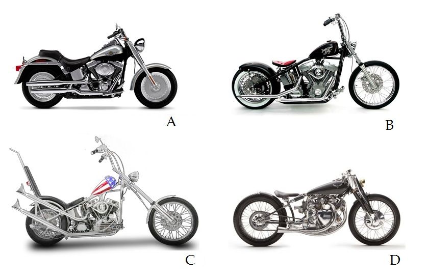 Olhando para a figura abaixo, dá para reconhecer bem a cruiser (A) por se parecer com uma H-D antiga, a bobber (B) por ser bem peladona, e a chopper (C) por ser enfeitada e por ter um garfo alongado.
